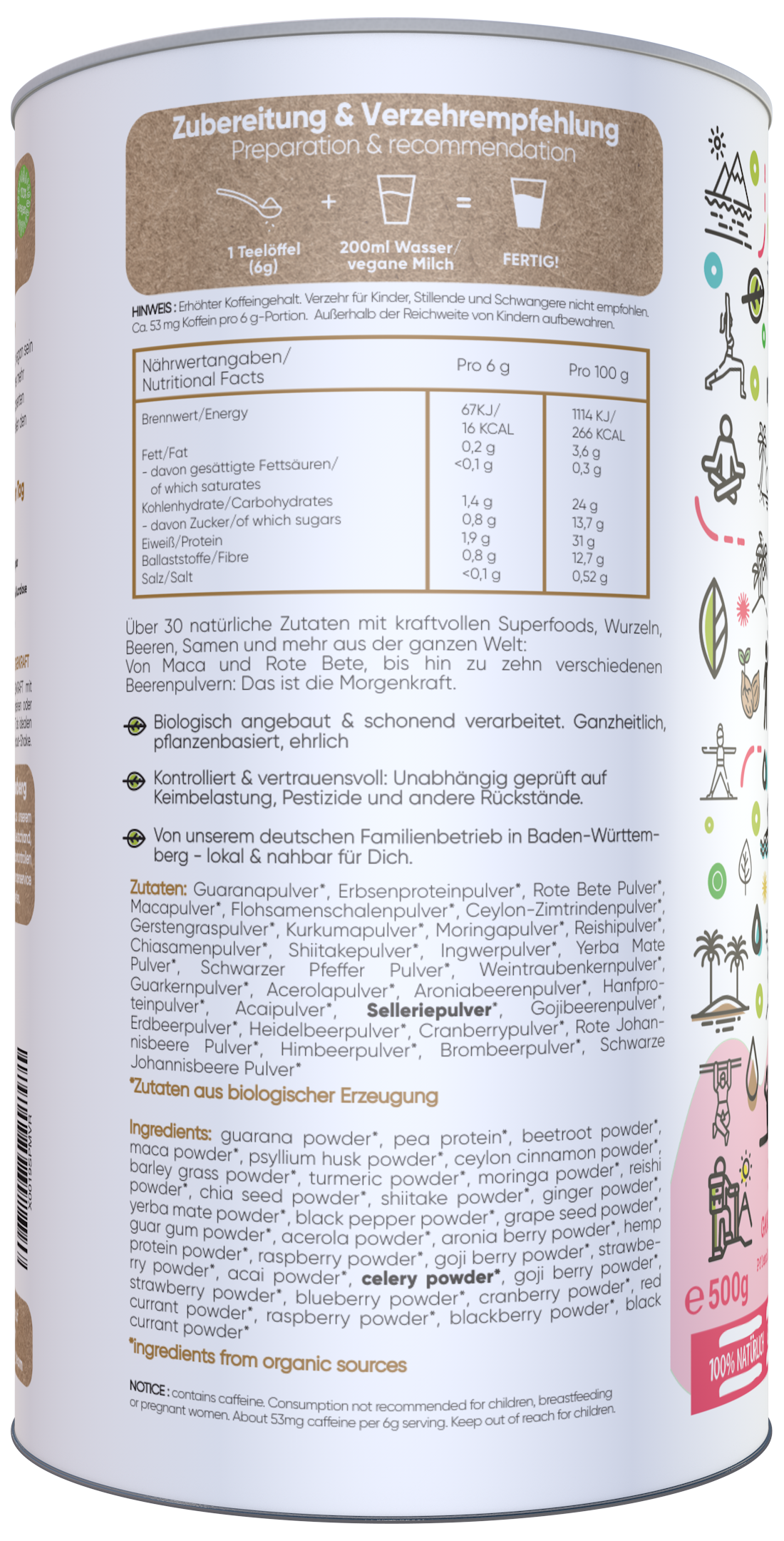Mit 53 mg pflanzlichem Koffein aus Guarana und Yerba Mate pro Portion sorgt die BIO Morgenkraft für einen sanften, nachhaltigen Koffeinschub. Ideal für den Morgen, den Nachmittag oder vor deinem Workout.