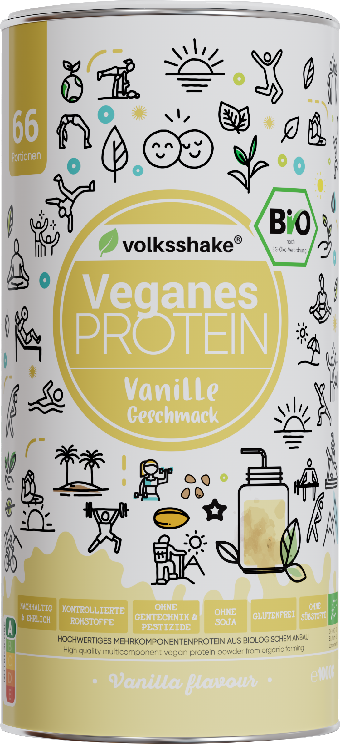 Die sorgfältig zusammengestellte Kombination aus 10 pflanzlichen Proteinquellen ist eine hervorragende Alternative zu Whey-Protein. Volksshake Bio-Proteinpulver ist leicht verdaulich dank hydrolysiertem Erbsenprotein, sehr reich an Eiweiß und essenziellen Aminosäuren und somit ideal für den Muskelaufbau und -erhalt! Dank der hohen biologischen Wertigkeit ist es nicht nur für Veganer eine optimale Wahl, sondern auch für alle, die sich bewusst und nachhaltig ernähren möchten.