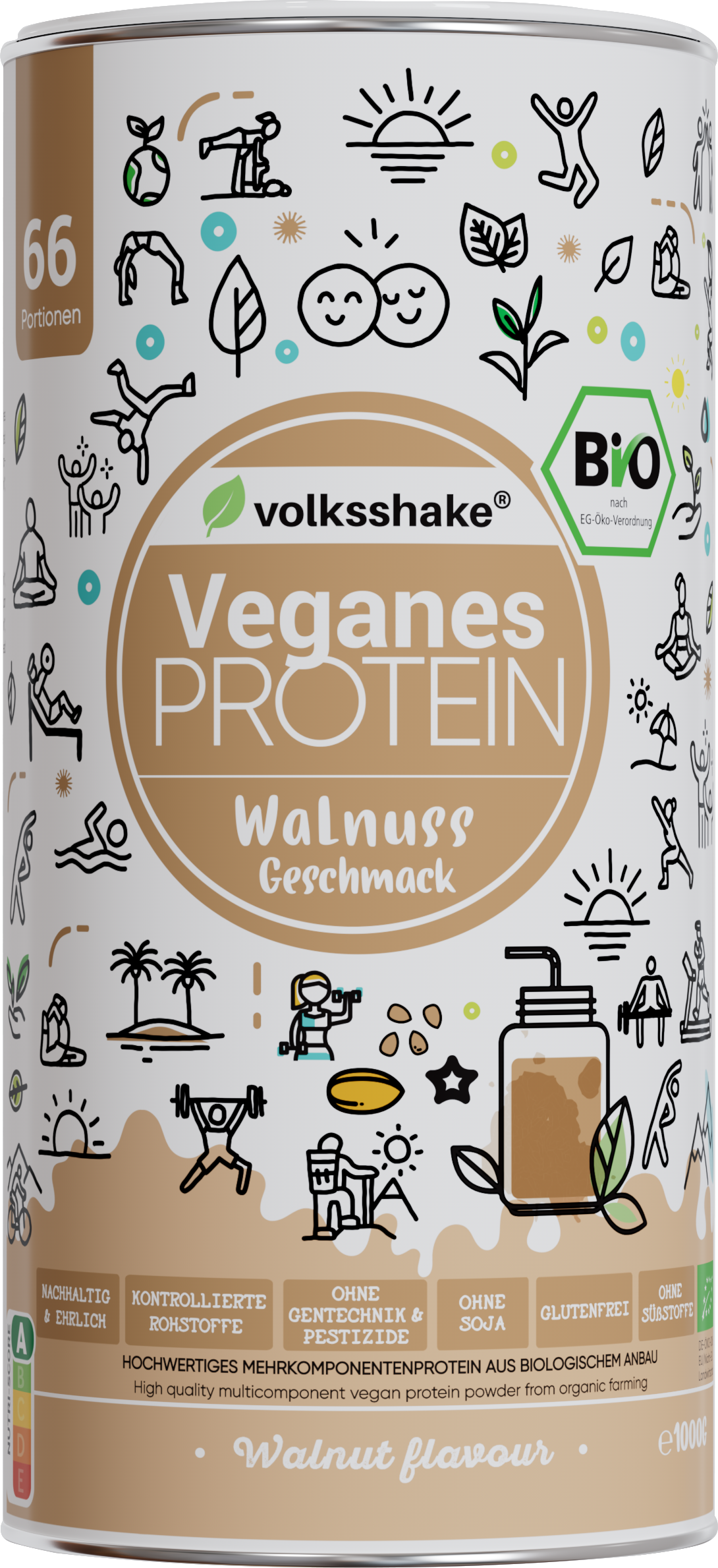 Die sorgfältig zusammengestellte Kombination aus 10 pflanzlichen Proteinquellen ist eine hervorragende Alternative zu Whey-Protein. Volksshake Bio-Proteinpulver ist leicht verdaulich dank hydrolysiertem Erbsenprotein, sehr reich an Eiweiß und essenziellen Aminosäuren und somit ideal für den Muskelaufbau und -erhalt! Dank der hohen biologischen Wertigkeit ist es nicht nur für Veganer eine optimale Wahl, sondern auch für alle, die sich bewusst und nachhaltig ernähren möchten.